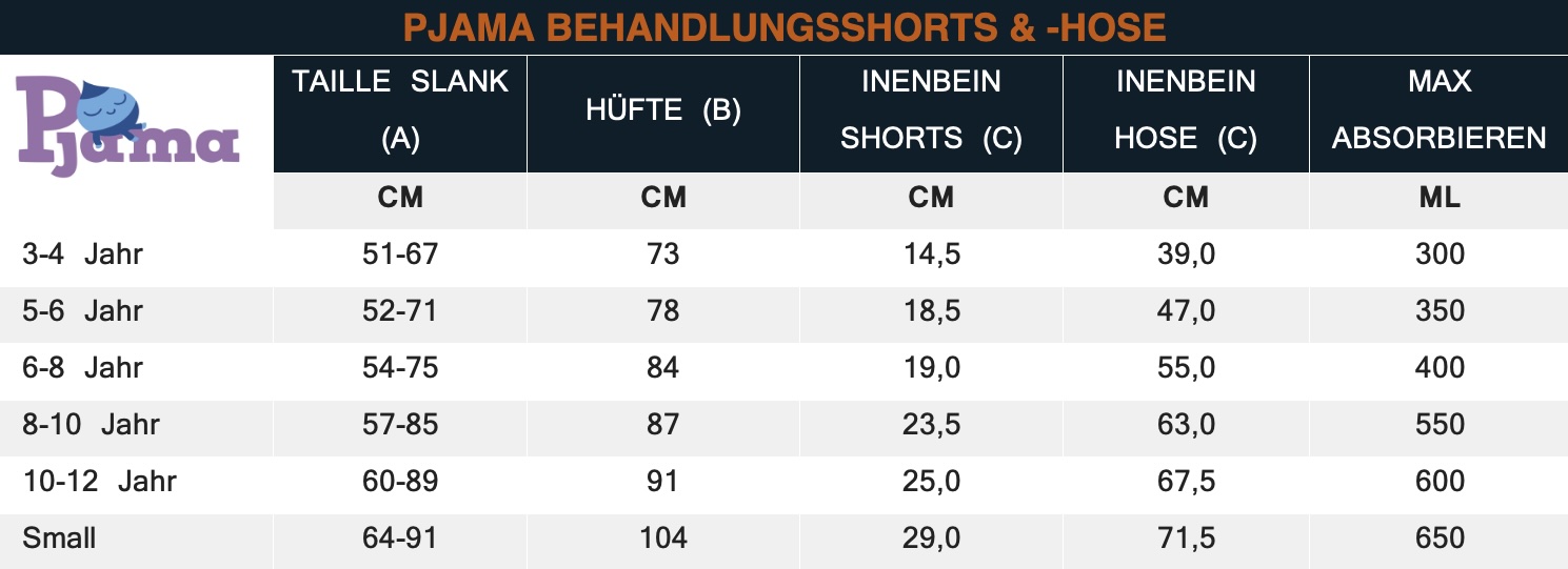 Pjama Protect Bettnässerhosen sind laut Größentabelle in den Größen von 3-4 Jahren bis XL für Kinder und Erwachsene erhältlich.